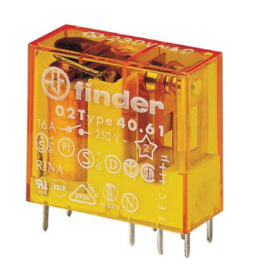 رله فیندر 406182300000 از نوع رله PCB مینیاتوری(کتابی) 16 آمپری ساخت فیندر ایتالیا با ولتاژ بوبین 230ولت AC است. این رله 8 پایه و دارای یک کنتاکت (یک باز و یک بسته مجزا) است که می‌توان مستقیم روی برد یا از طریق سوکت ۹۵۱۵ متصل کرد و از طریق سوکت ۹۵۰۵ روی ریل مینیاتوری و داخل تابلو استفاده کرد. کد فنی این رله 40.61.8.230.0000 است. رنگ نارنجی بدنه این رله نشان‌دهنده ولتاژ تحریک از نوع AC است.